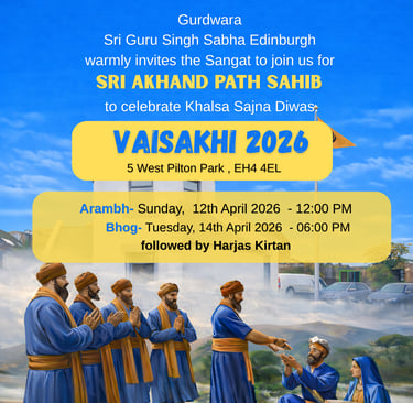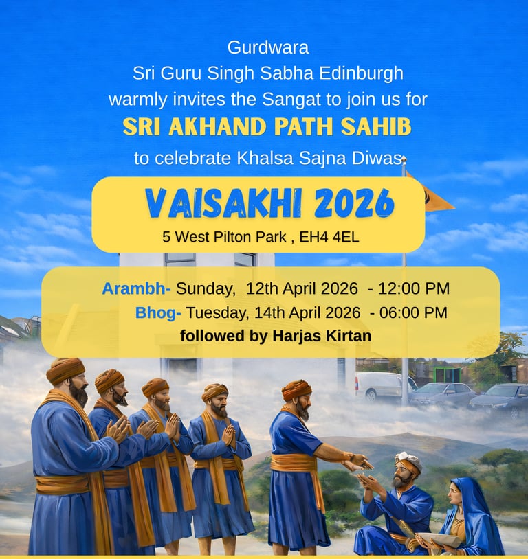 Gurdwara Sri Guru Singh Sabha Edinburgh warmly invites all Sangat to join us for the Sri Akhand Path Sahib to celebrate Khalsa Sajna Diwas.